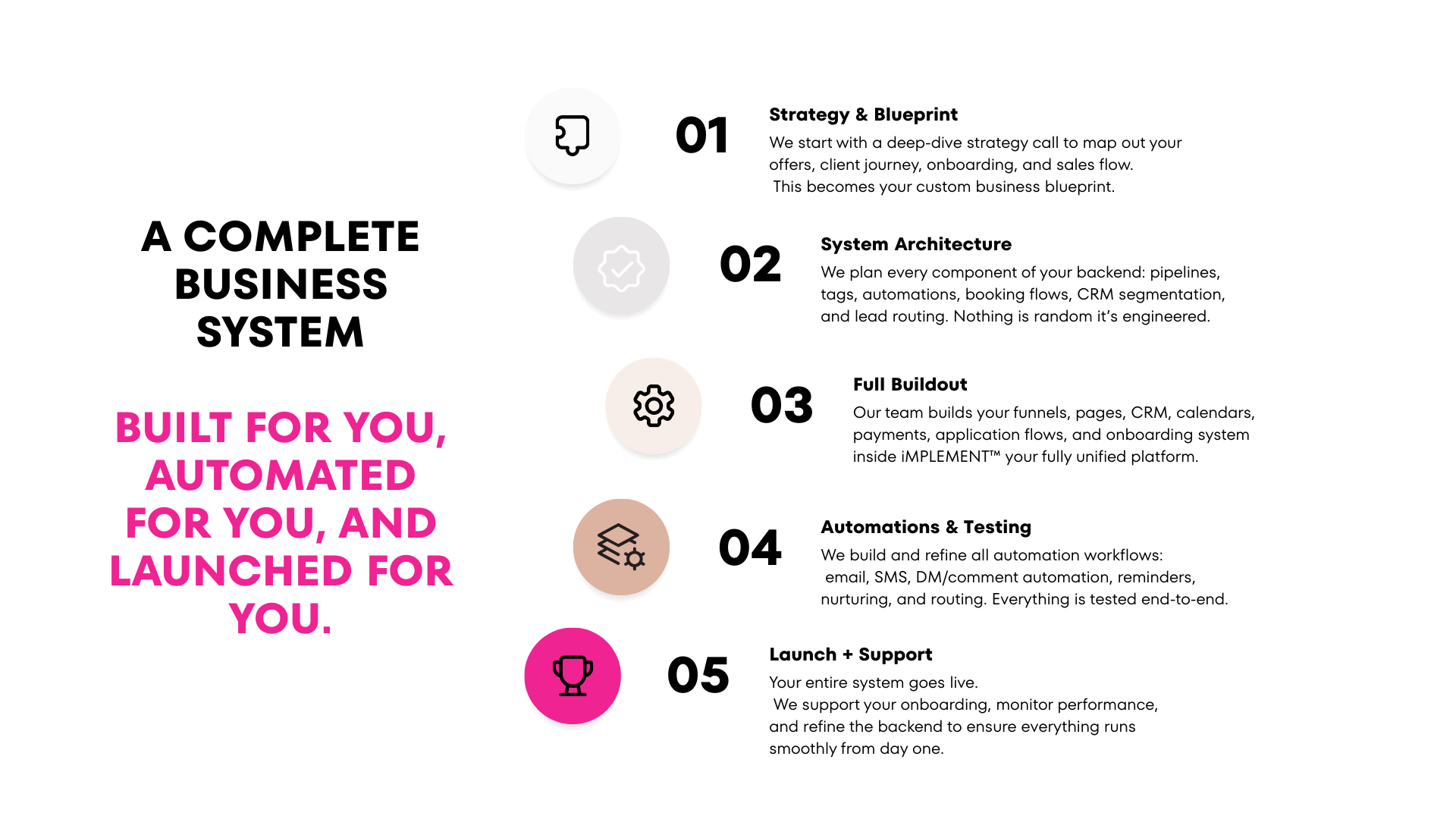 At Implementation Studio, we do things differently. We specialize in crafting high-converting funnels and automated systems, all fully done for you through our exclusive software. Say goodbye to the long waits of weeks or even months for your marketing systems to be up and running. Our innovative approach ensures your digital marketing solutions are implemented quickly and efficiently, without compromising quality. Experience the difference of swift, expertly executed strategies that propel your business forward.